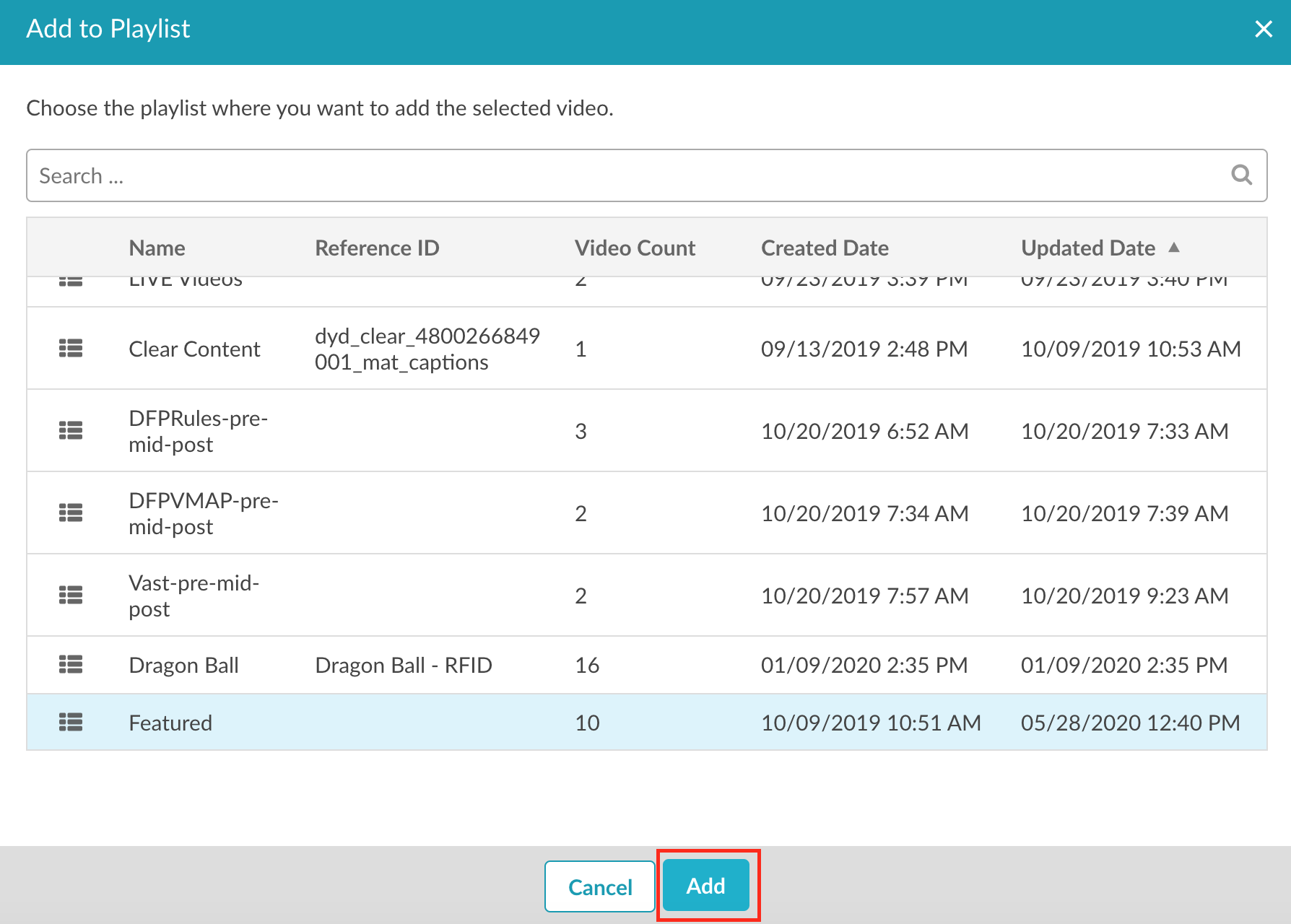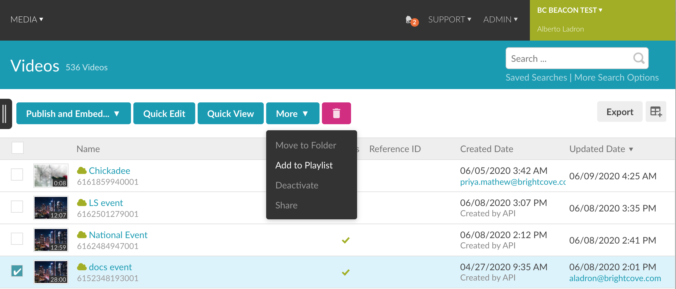7. Una vez que el recurso VOD se haya agregado a la lista de reproducción, vaya a la plataforma Brightcove Beacon.