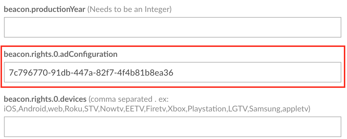 5. Desplácese hacia abajo y busque el campo Beacon.rights.0.adConfiguration y, a continuación, pegue el ID de la configuración de anuncios creada anteriormente.