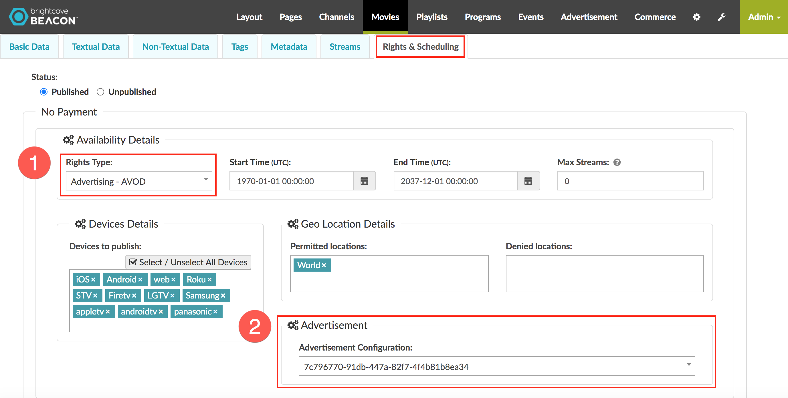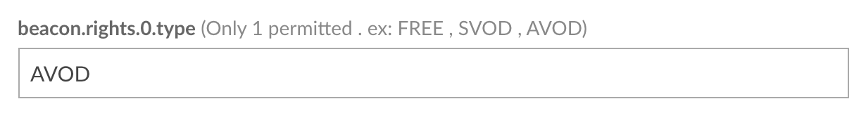 6. Siga desplazándose hacia abajo y en el campo beacon.rights.0.type escriba AVOD para categorizar este VOD como y Publicidad VOD.