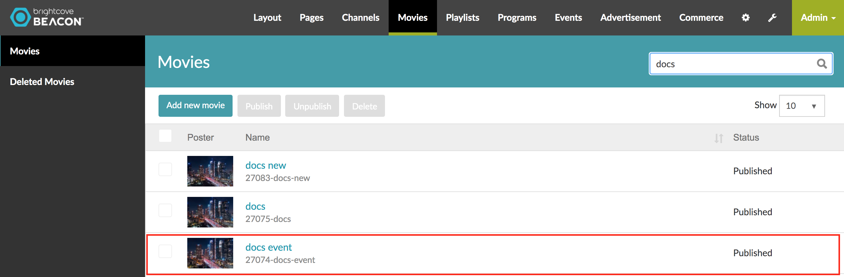 8. En el menú superior de Brightcove Beacon, haga clic en la ficha Películas .