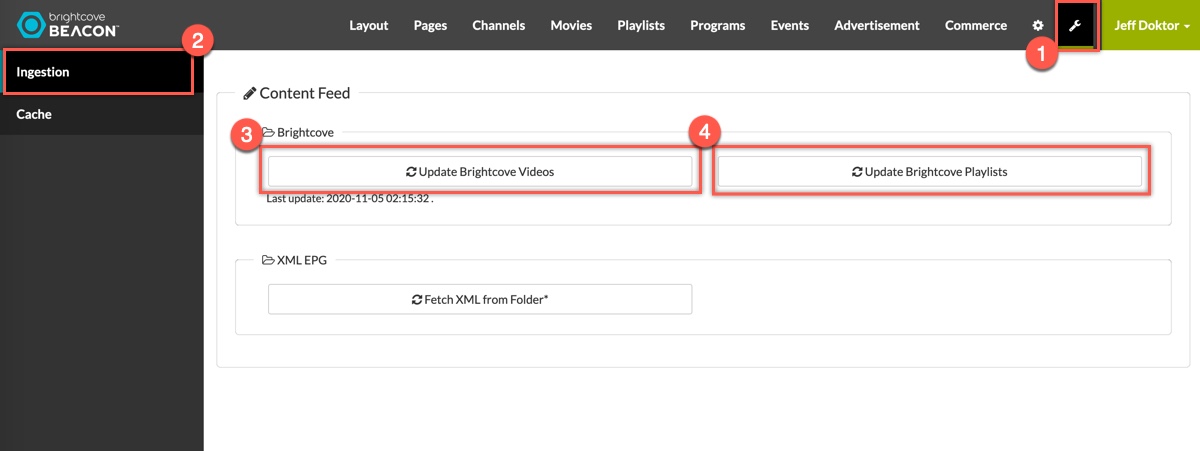 4. Haga clic en el botón Actualizar vídeos de Brightcove y/o en el botón Actualizar listas de reproducción de Brightcove .
