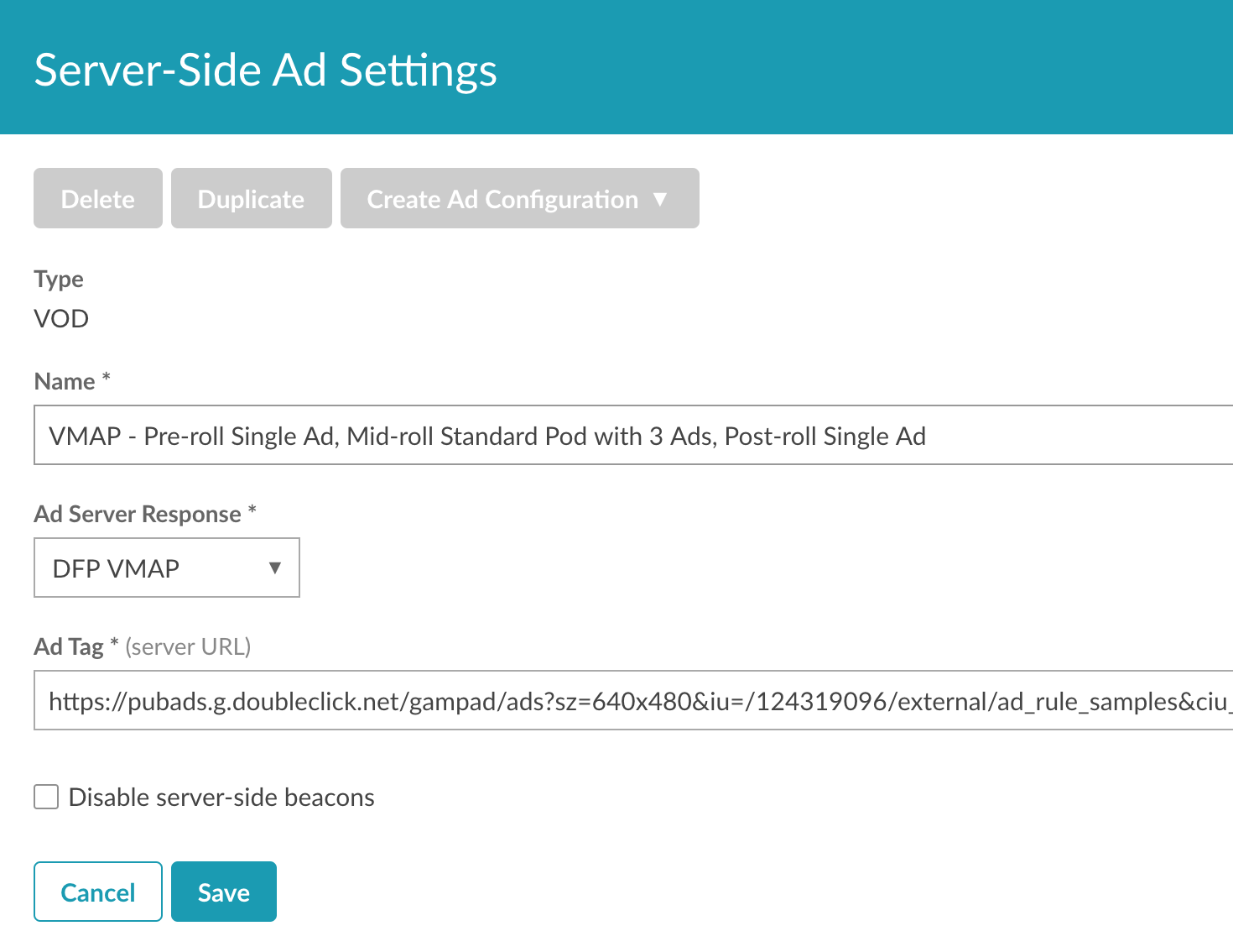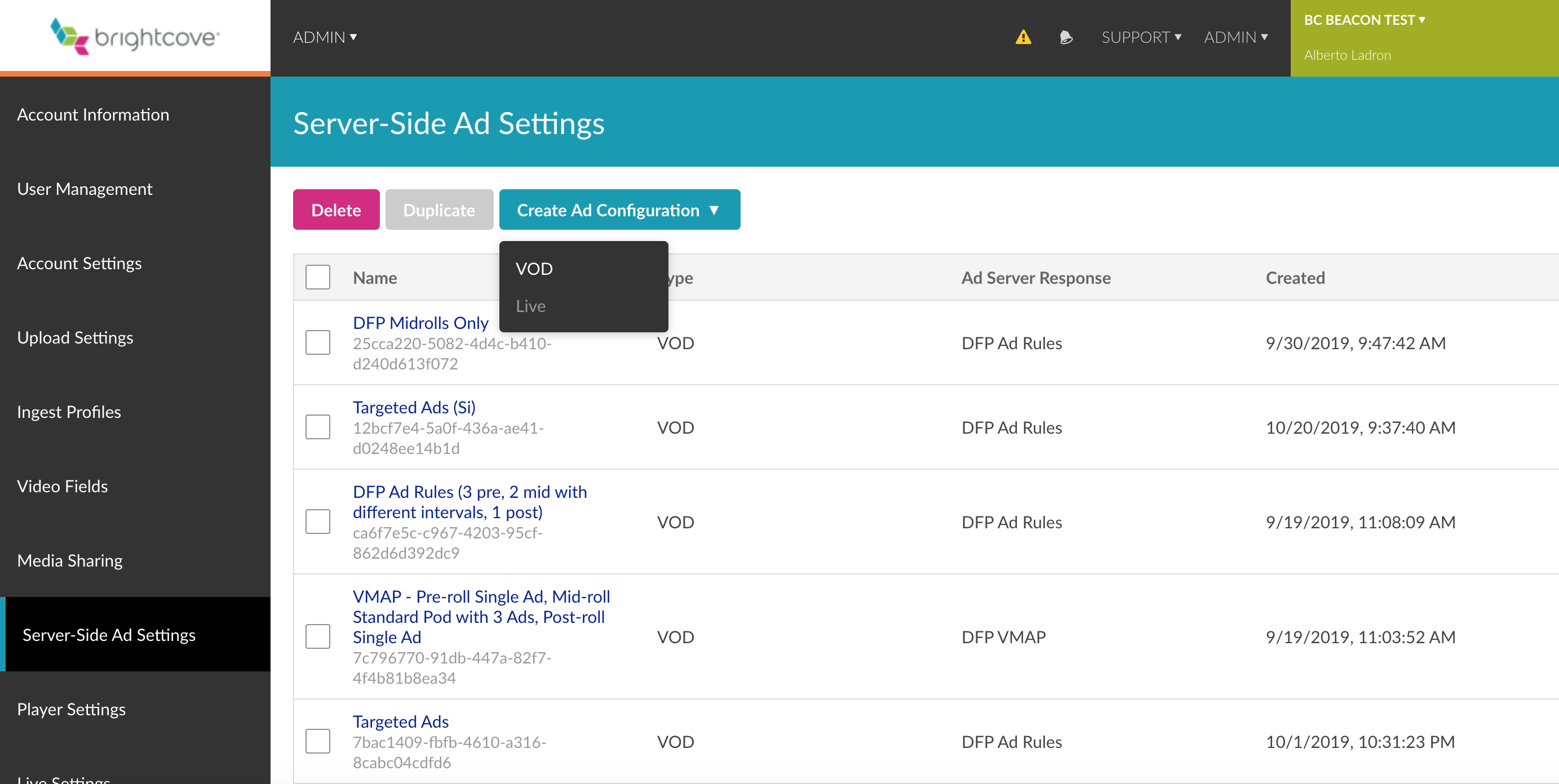 Aquí creará una configuración de anuncio SSAI para definir los anuncios mostrados en su activo de Brightcove Beacon VOD.